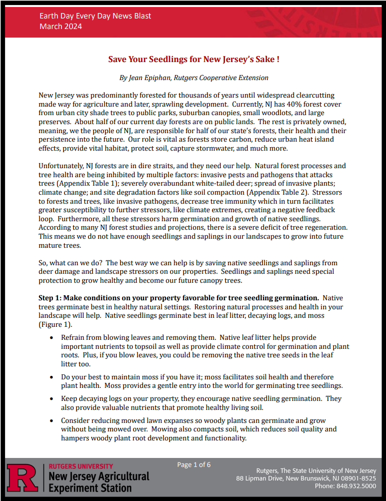 Yet, instead of diving into the doom and gloom of current day forest health issues, this article explains the best way the main public can help, by promoting growth of seedlings and saplings. No popular article in New Jersey has even done this before. Next the article provides four novel steps to promoting seedling growth that are typically overlooked in standard landscape care and management. Step one addresses that status quo mowing and blowing eliminates native tree germination potential and degrades soil quality, which is not widely known. Step two provides the reasons why learning seedling identification is important, so one does not promote the growth of invasive tree species. It also offers registration for a free spring webinar on tree seedling identification. Step three takes the reader through the method of creating your own sturdy wire mesh barriers to protect seedlings and sapling from deer damage. Step four explains how to reduce common site stressors that harm soil health. This step teaches how restoring natural processes helps soil and seedlings become healthier and the importance of watering.
