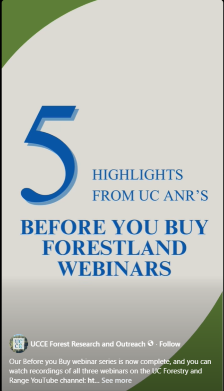 When it comes to WHY someone purchases forestland, the reasons are many and diverse. They can be personal (a place to raise a family or to ‘get away from it all’), ecological (to enjoy beauty or to protect wildlife habitat), or utilitarian (for hunting or timber products). No matter the reasons WHY, forest landowners need to decide what kind of forest steward they will be and know that stewardship activities will need to occur at some point. The UC ANR Forest Stewardship Education Team, along with the UC ANR Fire Network, recently completed a 3-part webinar and newsletter series to provide potential forest landowners with information and resources they can use to ask relevant questions and make informed decisions ‘before you buy’.