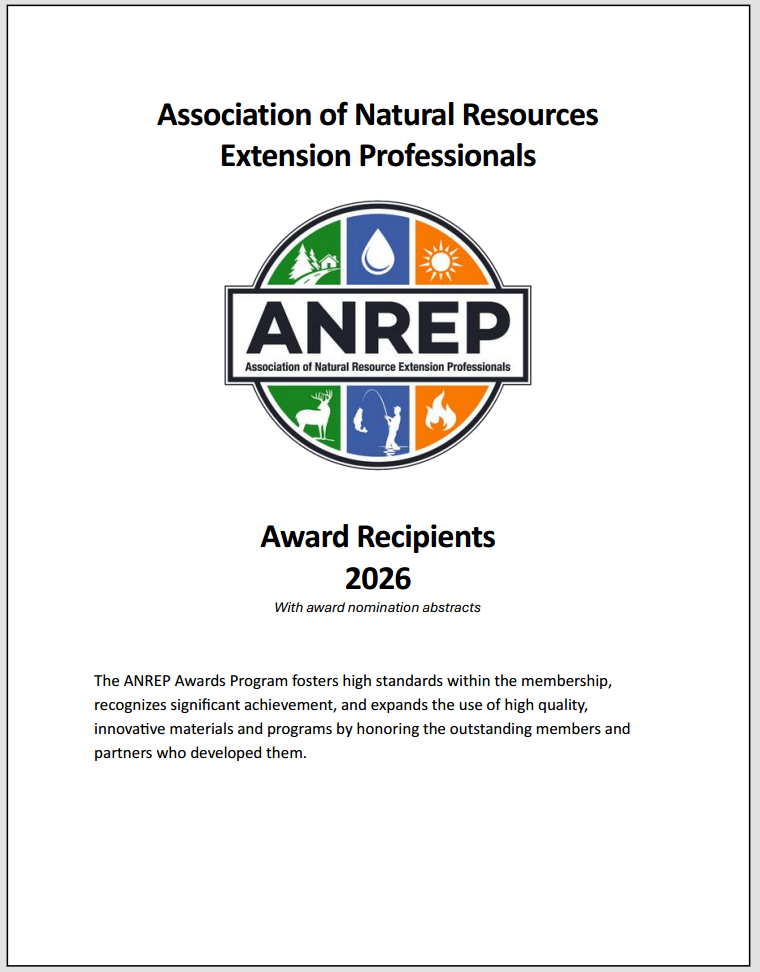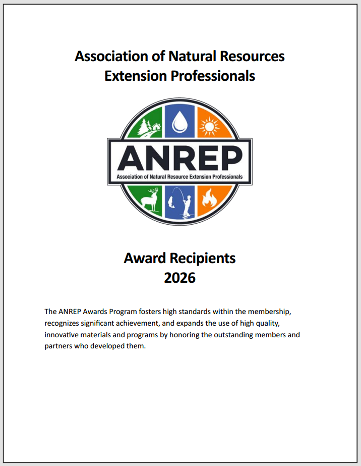 The ANREP Annual Awards Program is to encourage, support and recognize outstanding natural resource programs. This program strives to foster high standards among its members and help expand the use of high quality, innovative materials and programs by honoring the outstanding members and partners as well as the educational materials and programs they have developed.